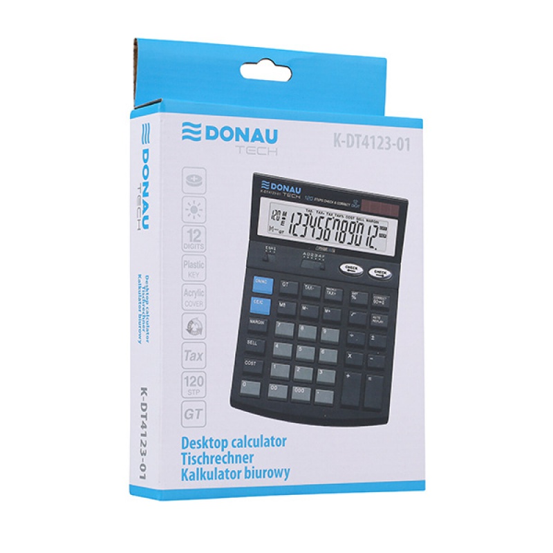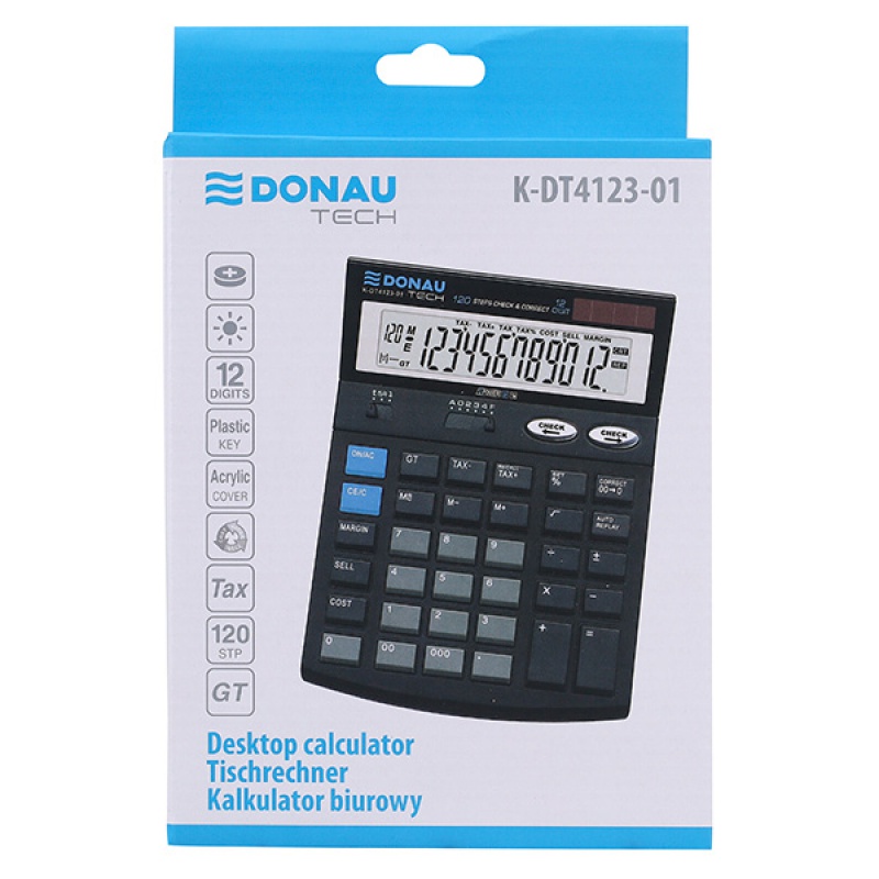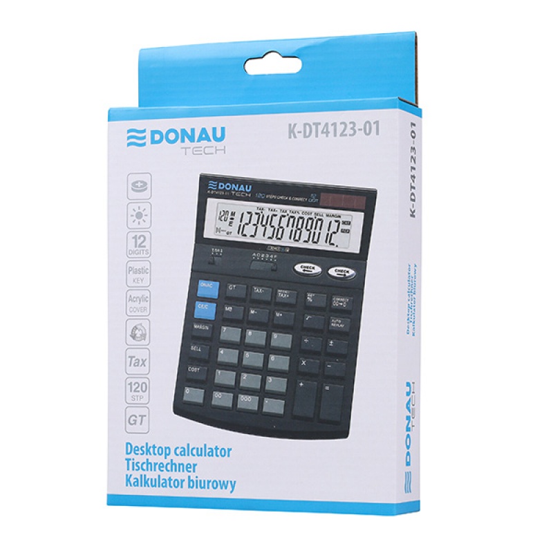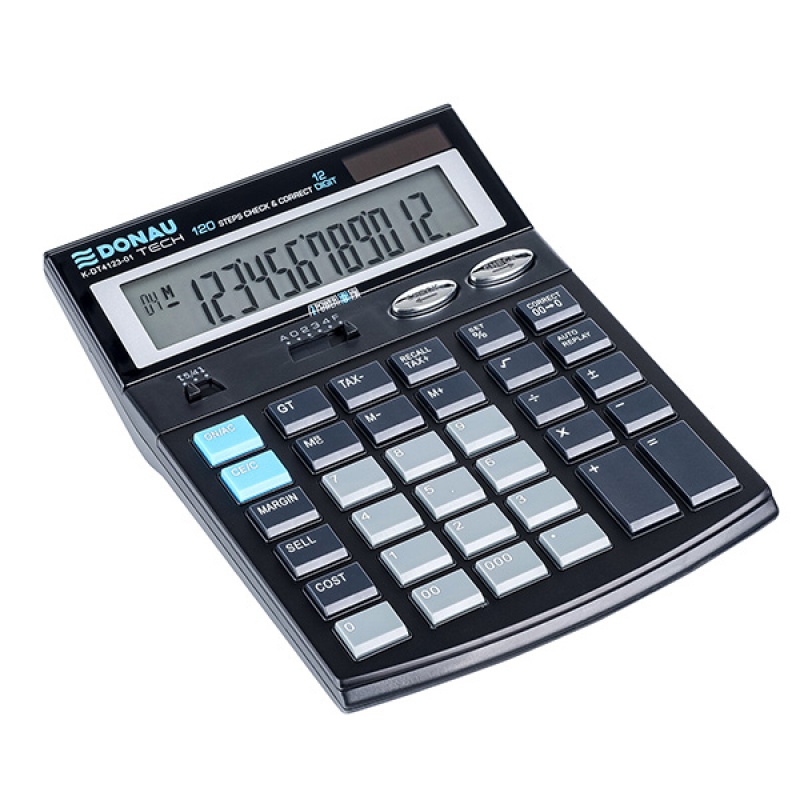 Kalkulator biurowy DONAU TECH, 12-cyfr. wyświetlacz, wym. 186x142x39 mm, czarny, Kalkulatory, Urządzenia i maszyny biurowe