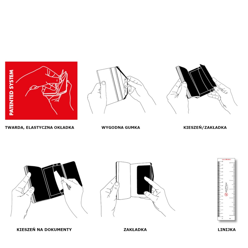• Notatnik posiada gumkę umożliwiającą zamknięcie notesu. Notatnik posiada również wewnętrzną wielofunkcyjną kieszeń, która służy do przechowywania drobnych dokumentów i notatek.