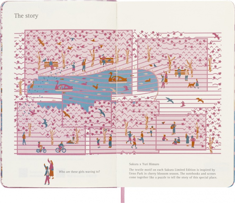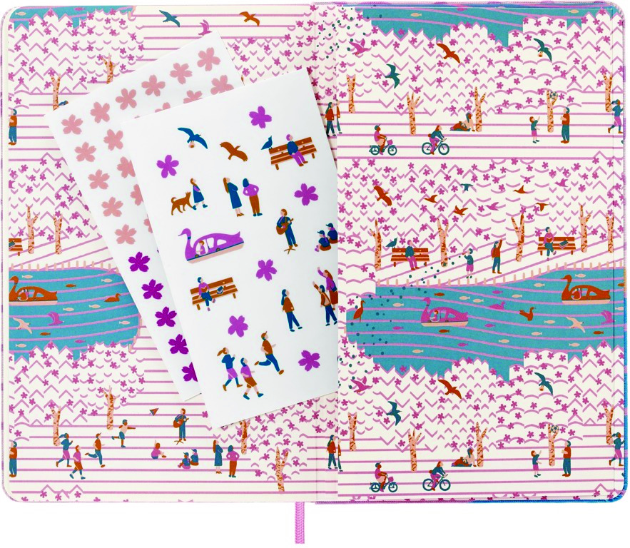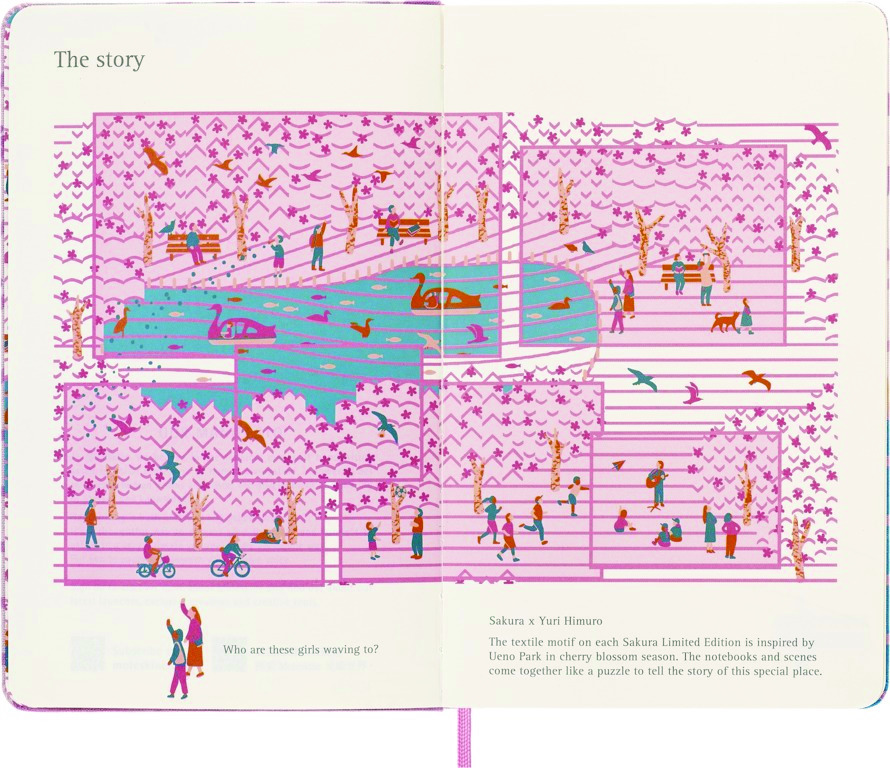 • Świętuj sezon sakura dzięki pracy utalentowanego projektanta tekstyliów, Yuri Himuro. Sakura od dawna symbolizuje wiosenne odrodzenie, a także kruchą i przemijającą naturę wszystkich rzeczy. Tkana grafika Yuri uchwyciła chwilę radości i refleksji, zapewniając przestrzeń do przekształcenia ulotnej inspiracji w długotrwałe projekty i plany. Motyw każdej tekstylnej okładki inspirowany jest Ueno Park w sezonie kwitnienia wiśni – miejscem bliskim sercu Jurija; każda okładka pokazuje inną scenę, która po umieszczeniu obok siebie pokazuje park w całości.